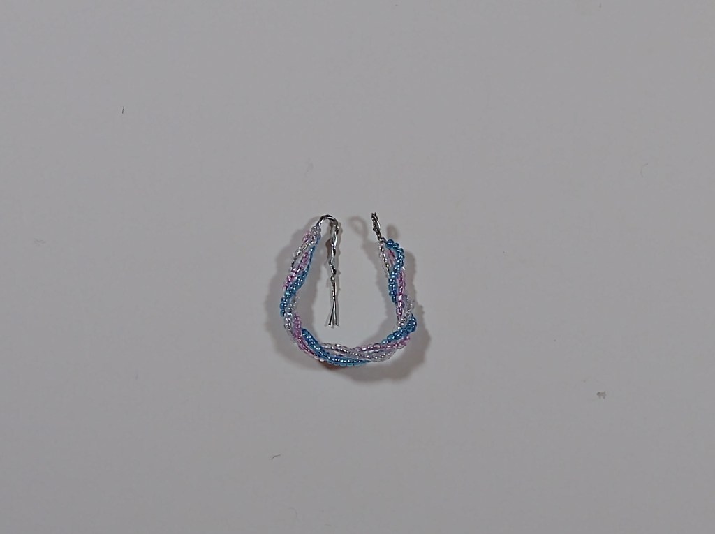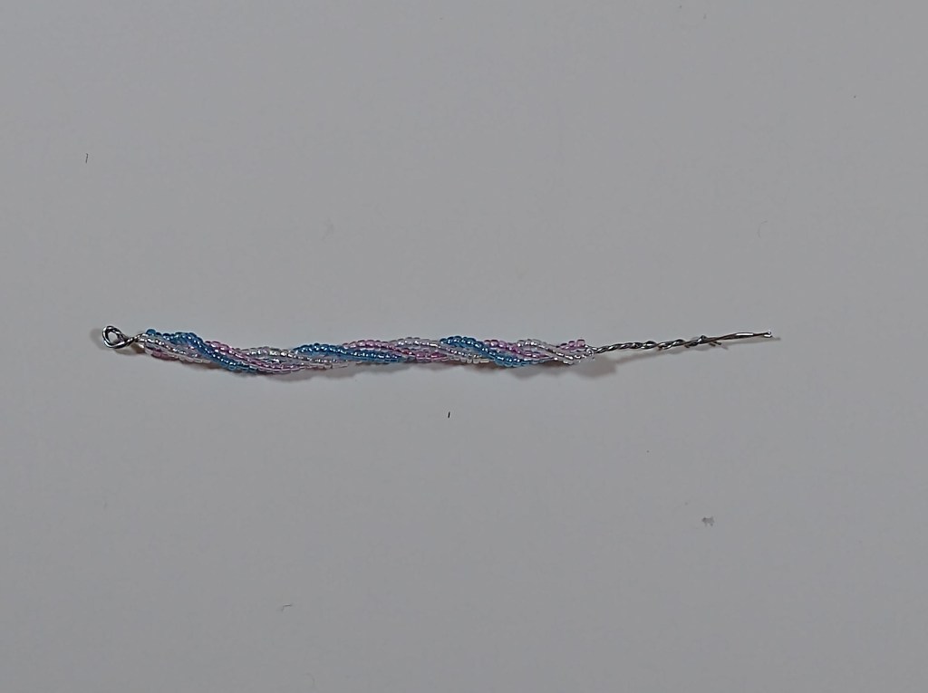 Now, I gently started to twist the three strands to create a spiral. I wanted a fairly tight spiral that showcased all the colors, but I didn’t want it so tight that I damaged the beads. About 3-4 turns seemed to do the job. As I twisted, I also started to shape the necklace into its final U-shape.