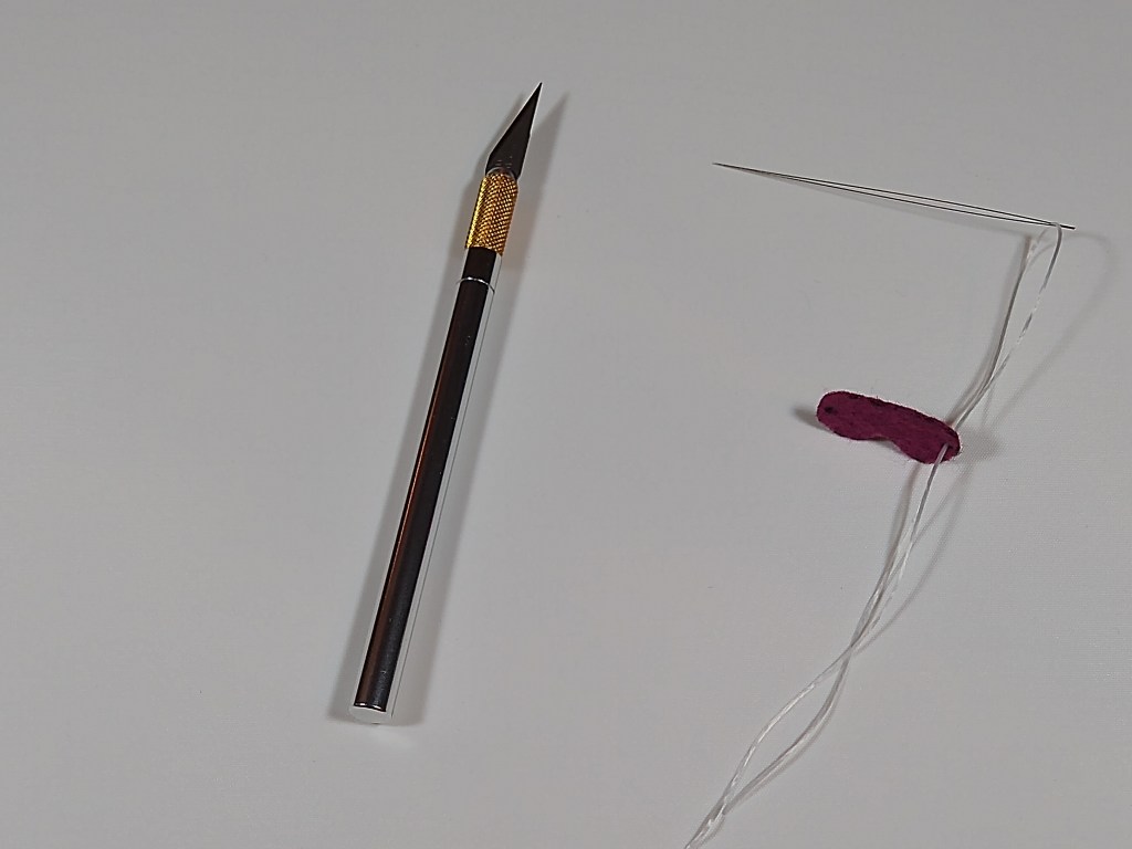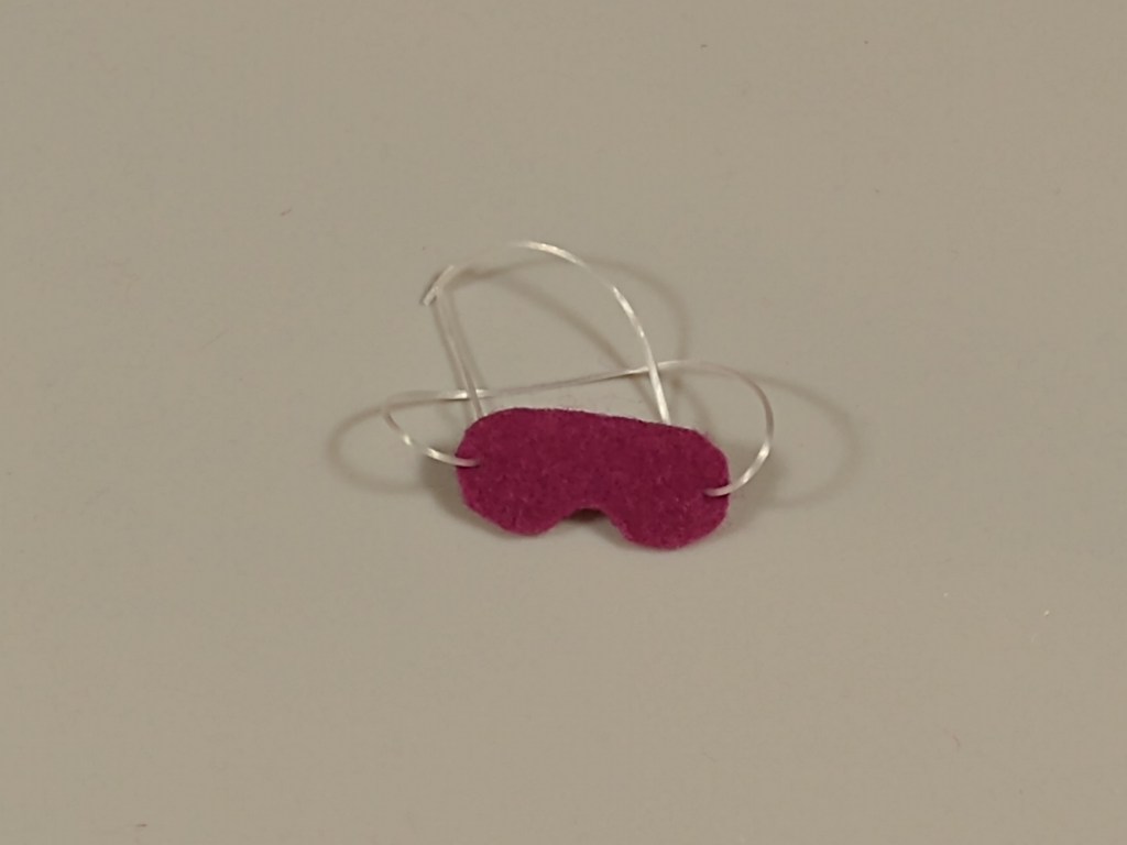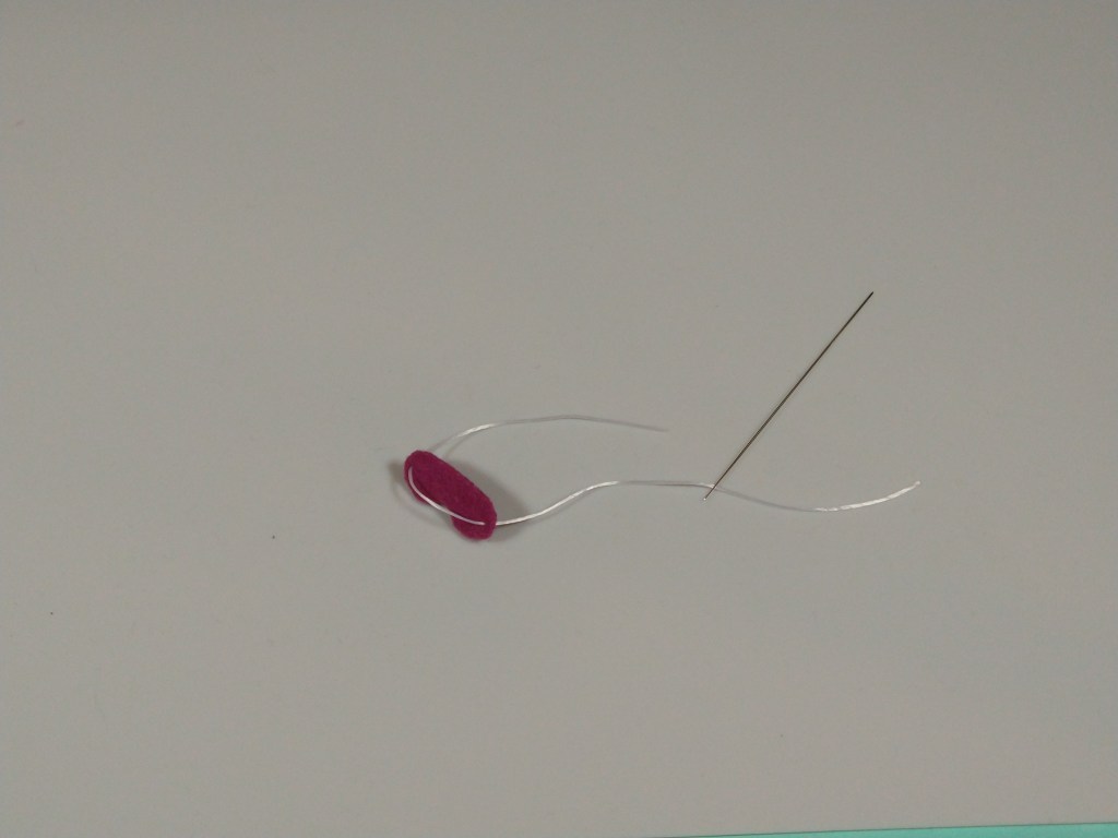 Using the craft knife and cutting board, I poked two small holes into the felt at the marked spots. I then cut 8″ of elastic thread, threaded it onto the big eye beading needle, and pulled the needle through the holes.