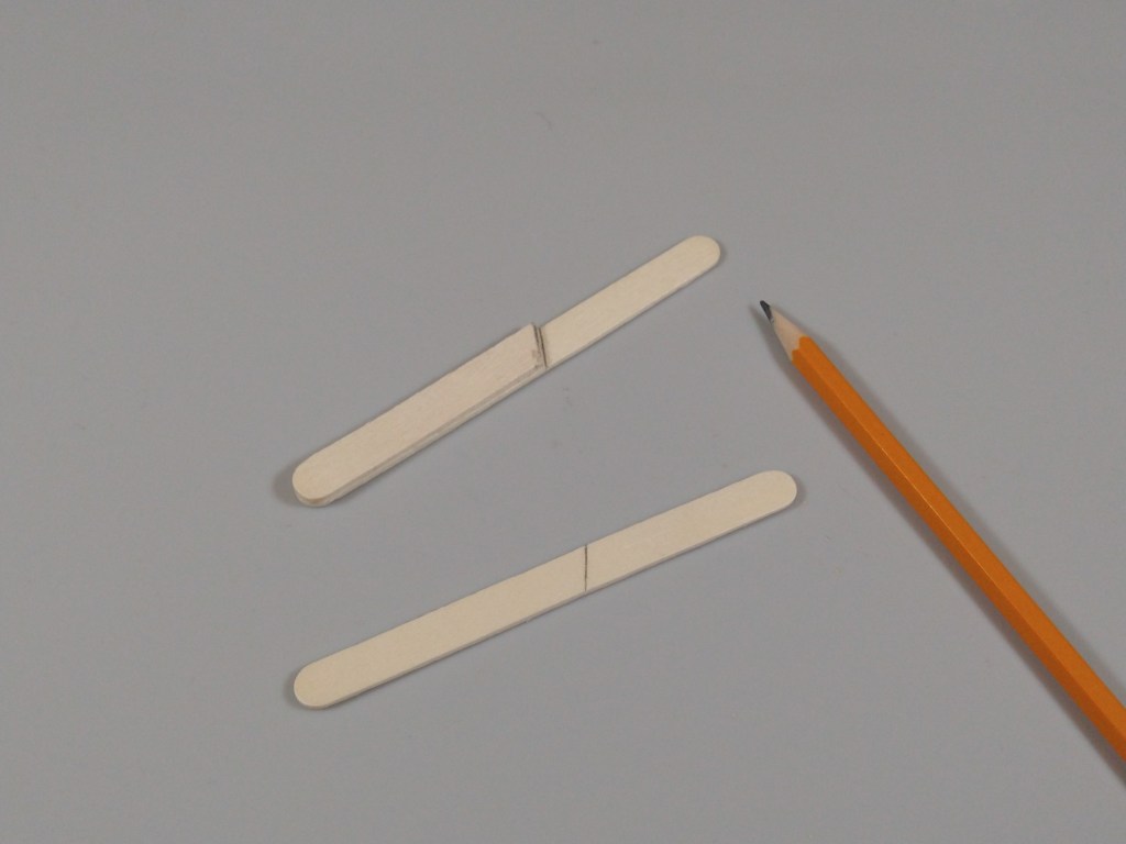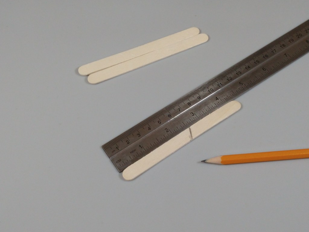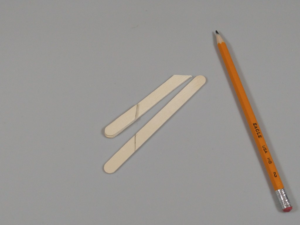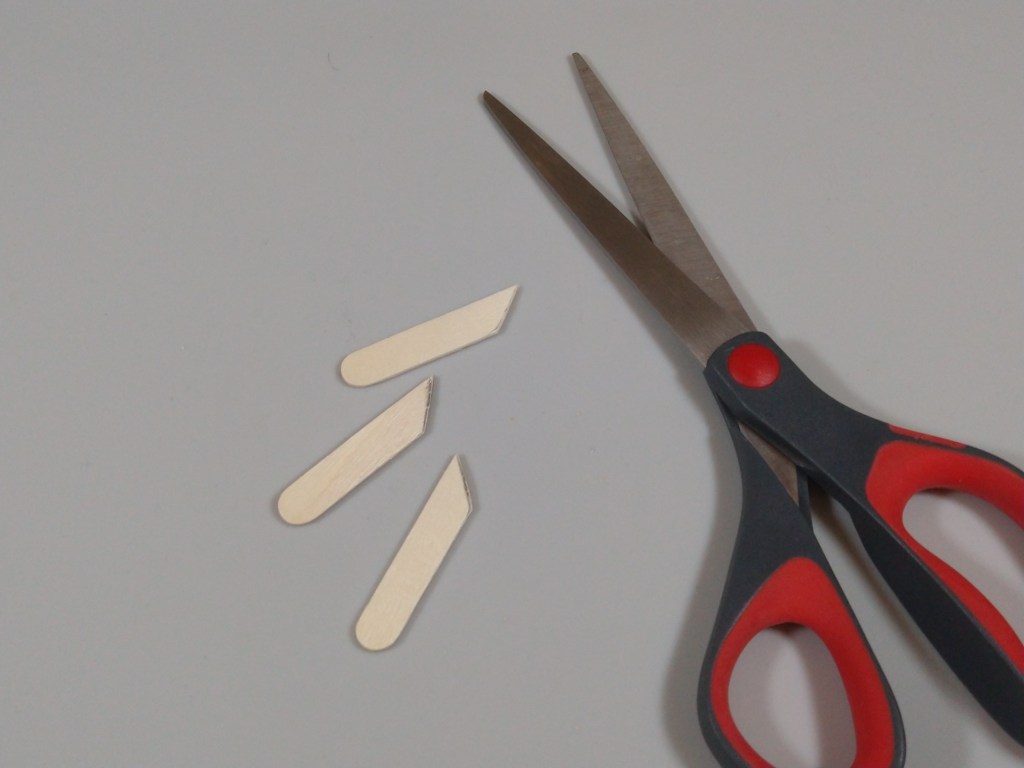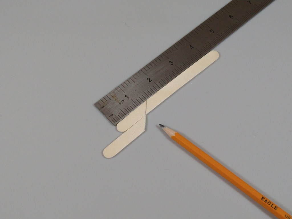 Next, I cut the sticks for the middle hooks. I marked and cut one craft stick at 1.3″ at a 45 degree angle, and used that stick as a template for the other two.