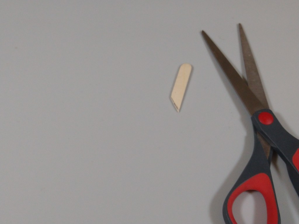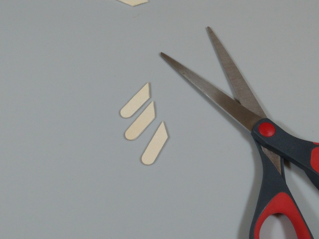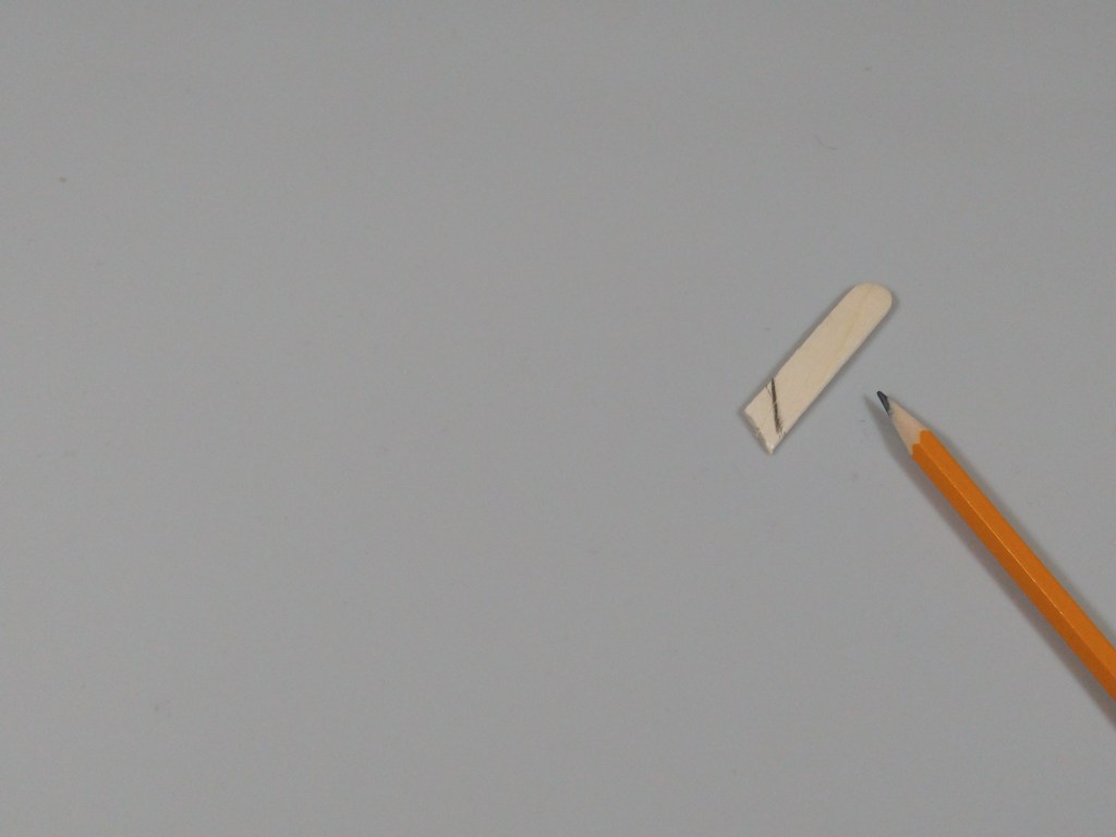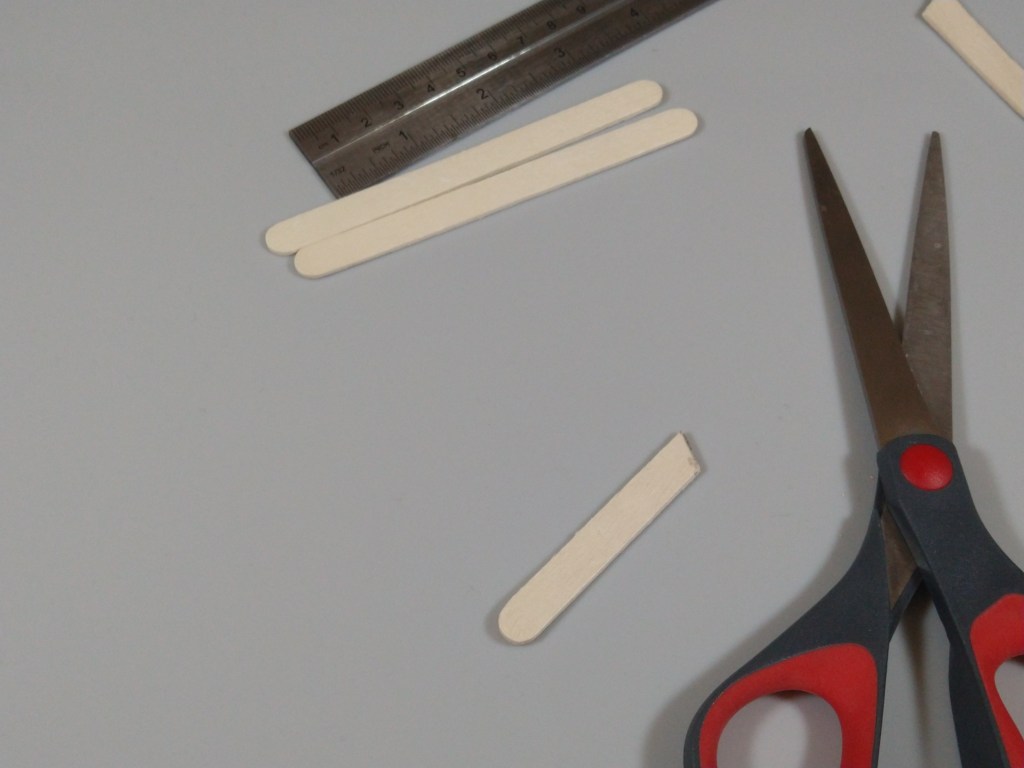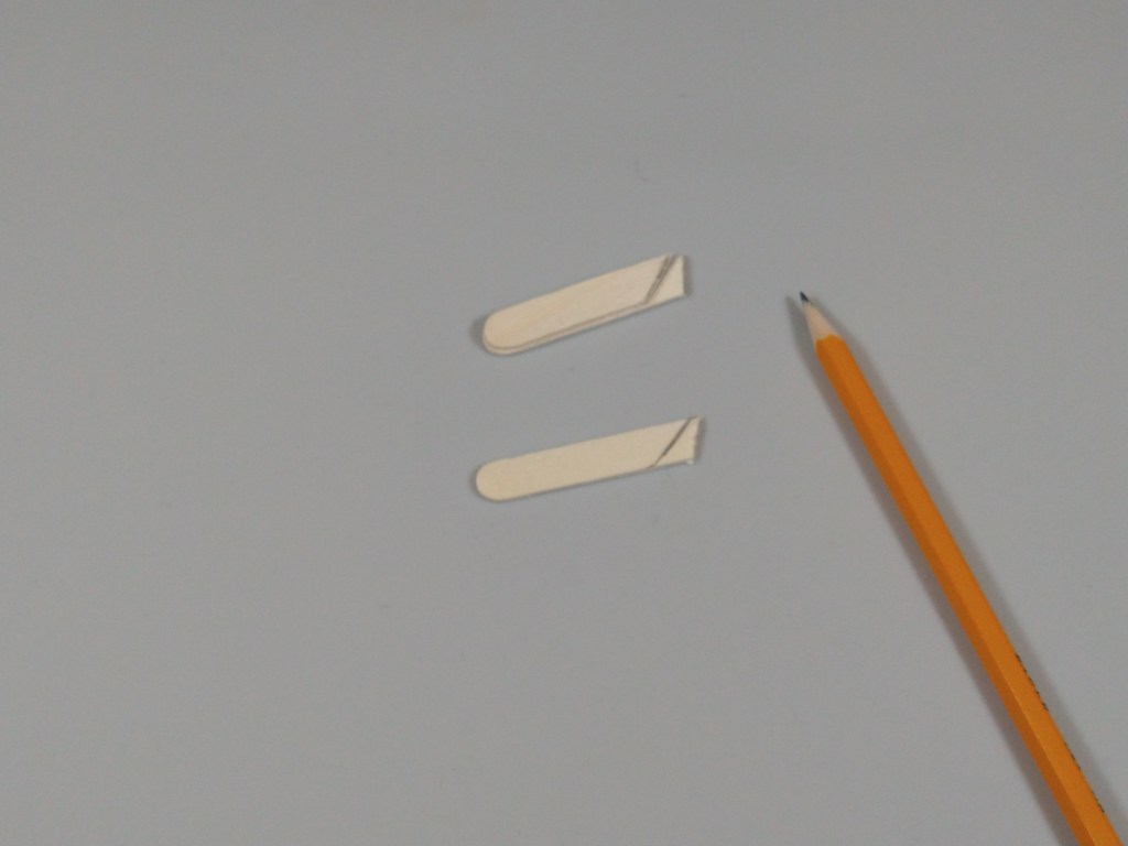 Next, I cut the sticks for the middle hooks. I marked and cut one craft stick at 1.3″ at a 45 degree angle, and used that stick as a template for the other two.