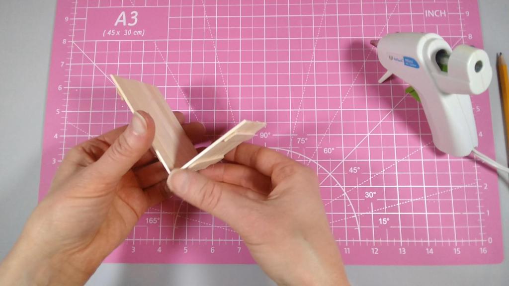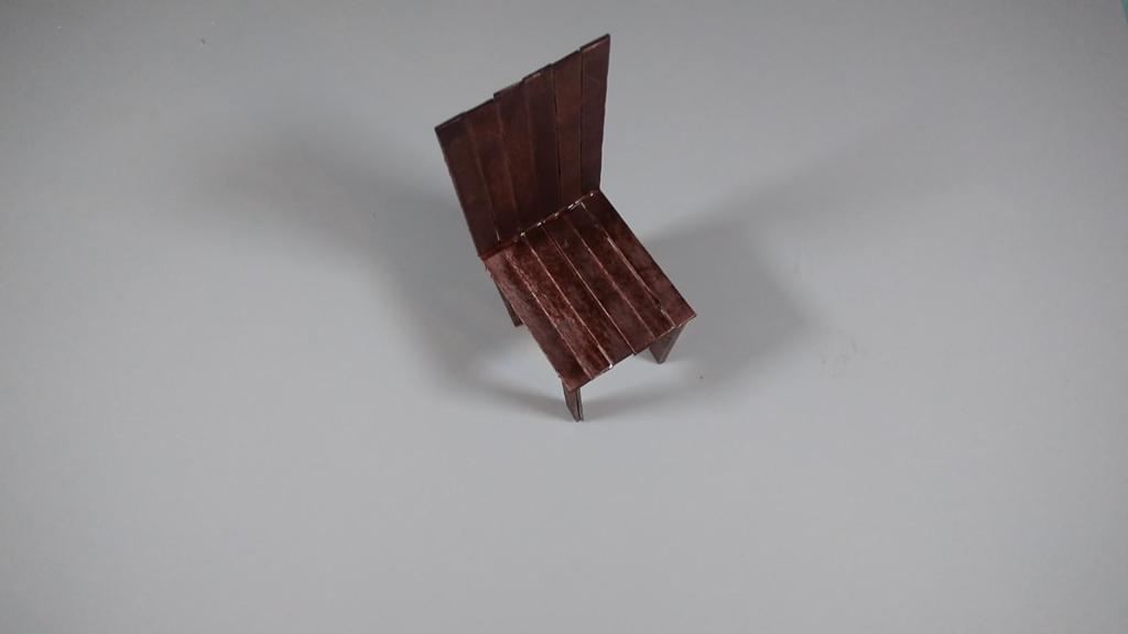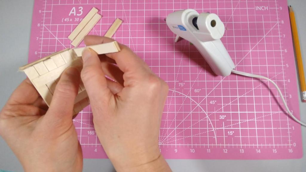 Then, I cut one craft stick in half and glued that to the back of the other six to form the back of the chair.