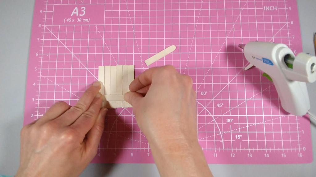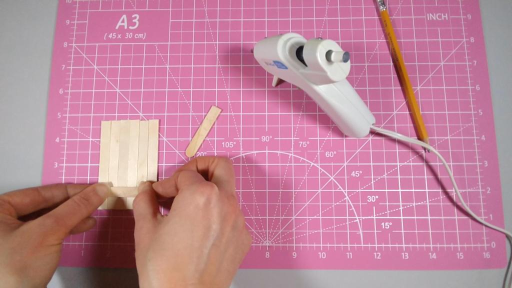 I took six of these sticks and arranged them in a line. I cut one new craft stick in half and glued it to these six to form the seat of the chair.