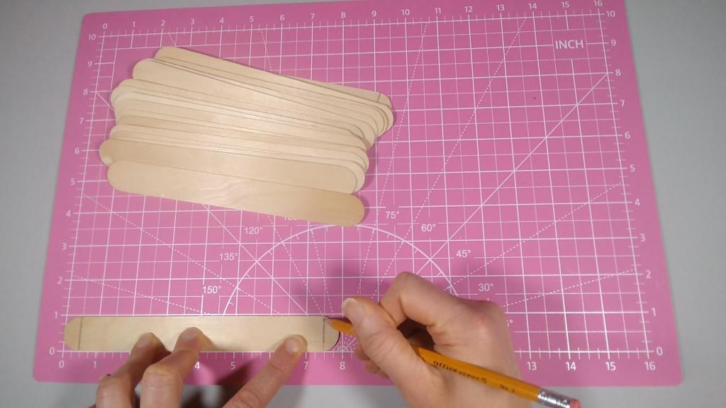 First, I took eighteen of the jumbo craft sticks, measured and cut 0.5″ from the end on each.
