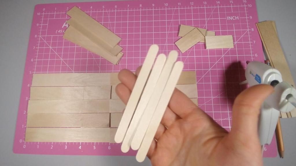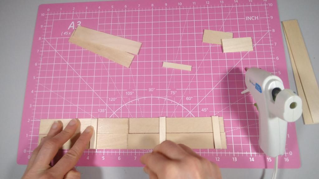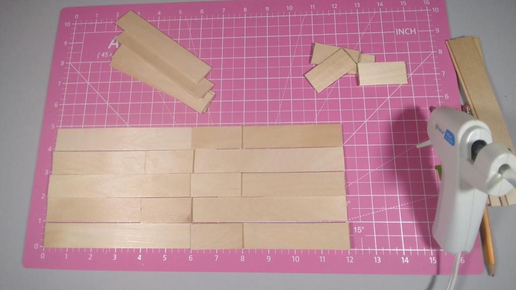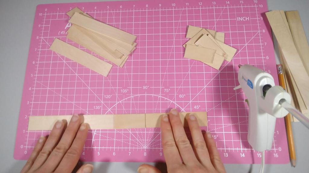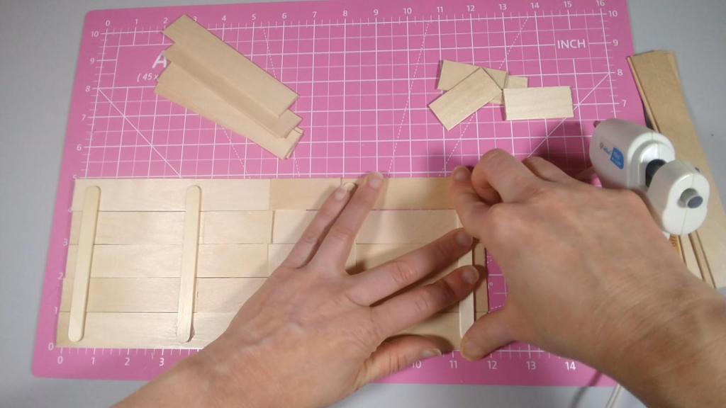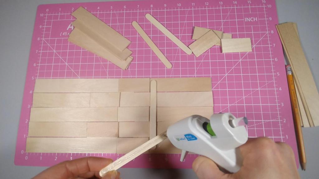 Next, I created two more “boards” like the ones I had just glued together. These would form the bench. I glued them together with two regular craft sticks that I cut into 2″ pieces.