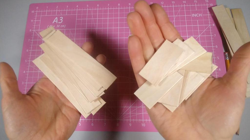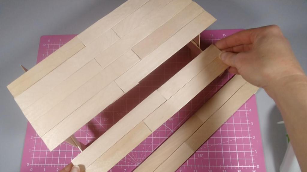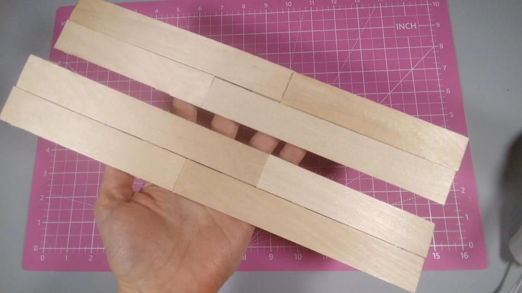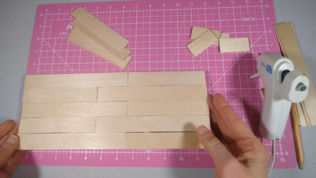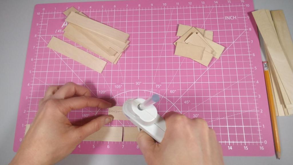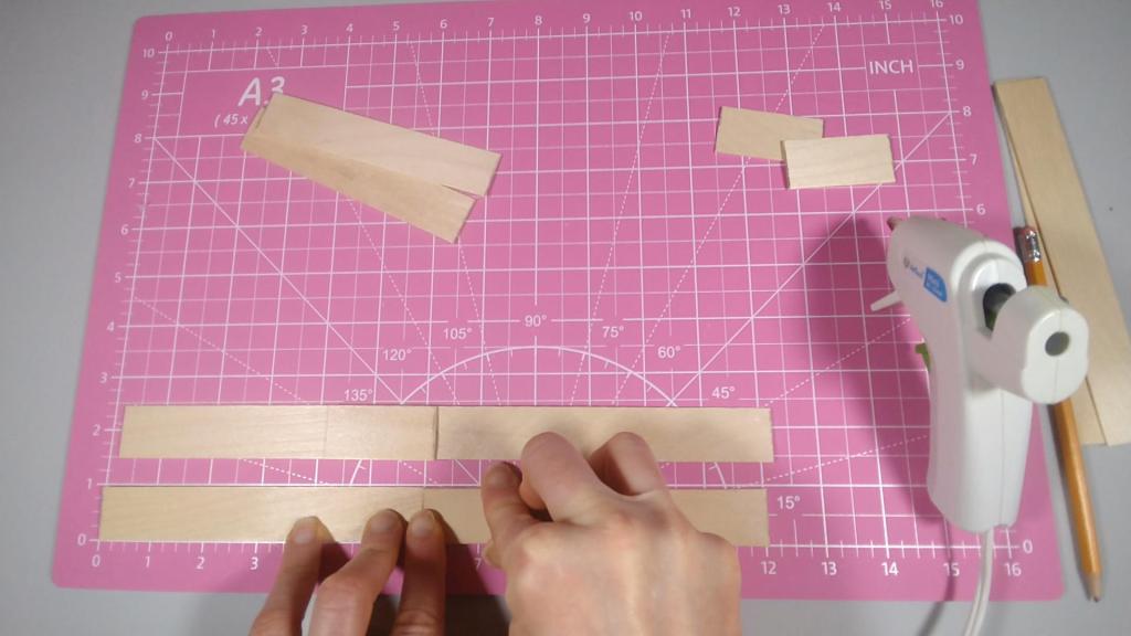 Next, I created two more “boards” like the ones I had just glued together. These would form the bench. I glued them together with two regular craft sticks that I cut into 2″ pieces.