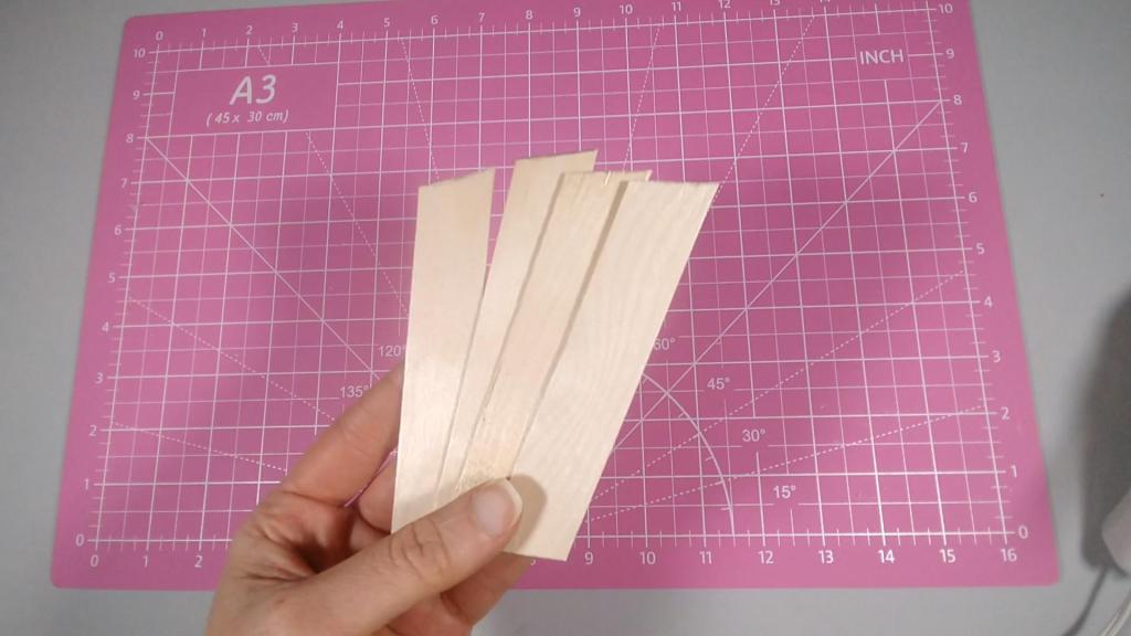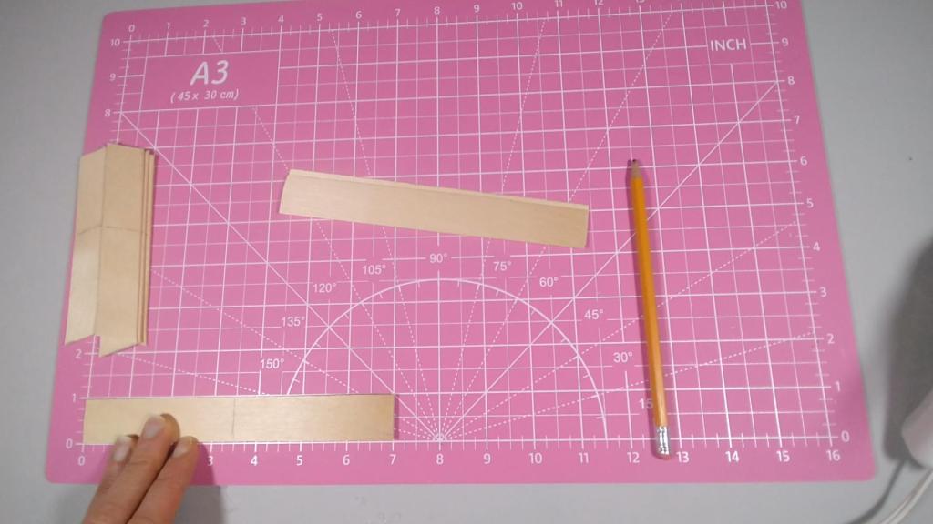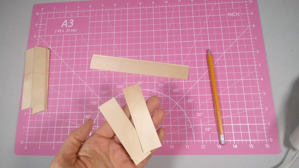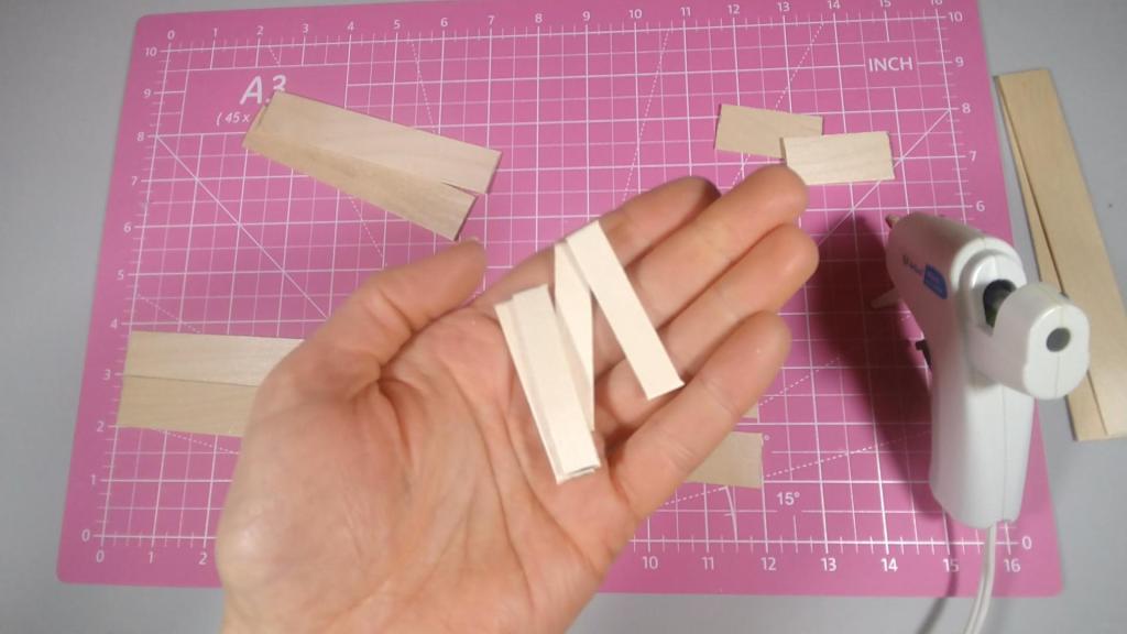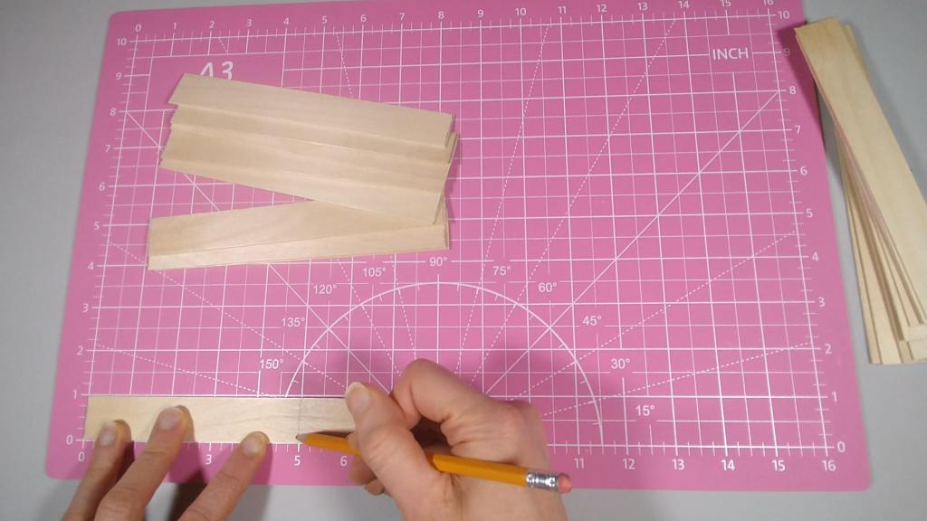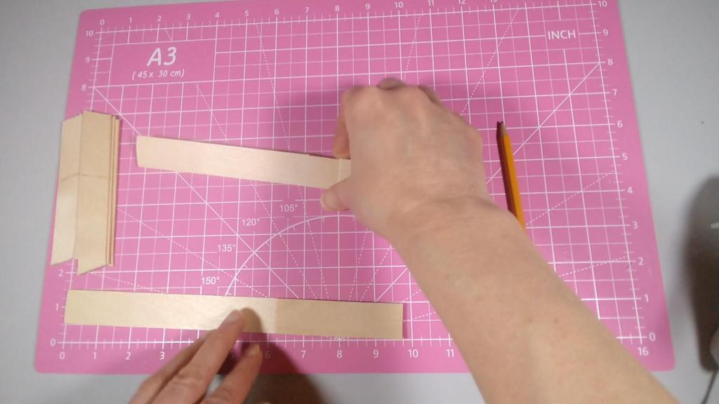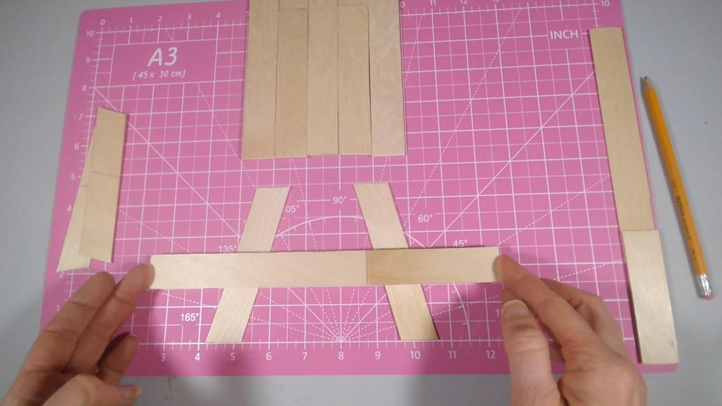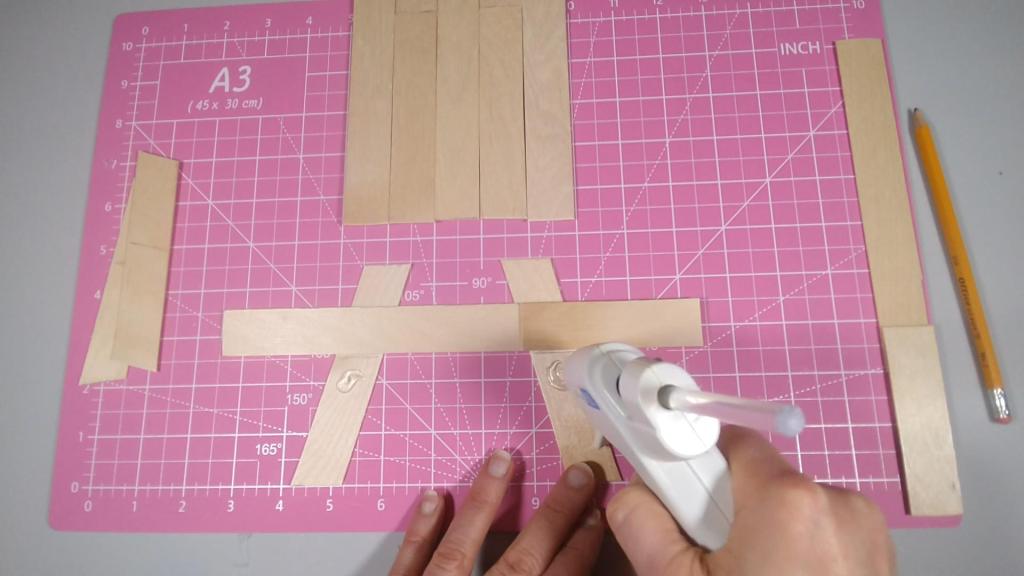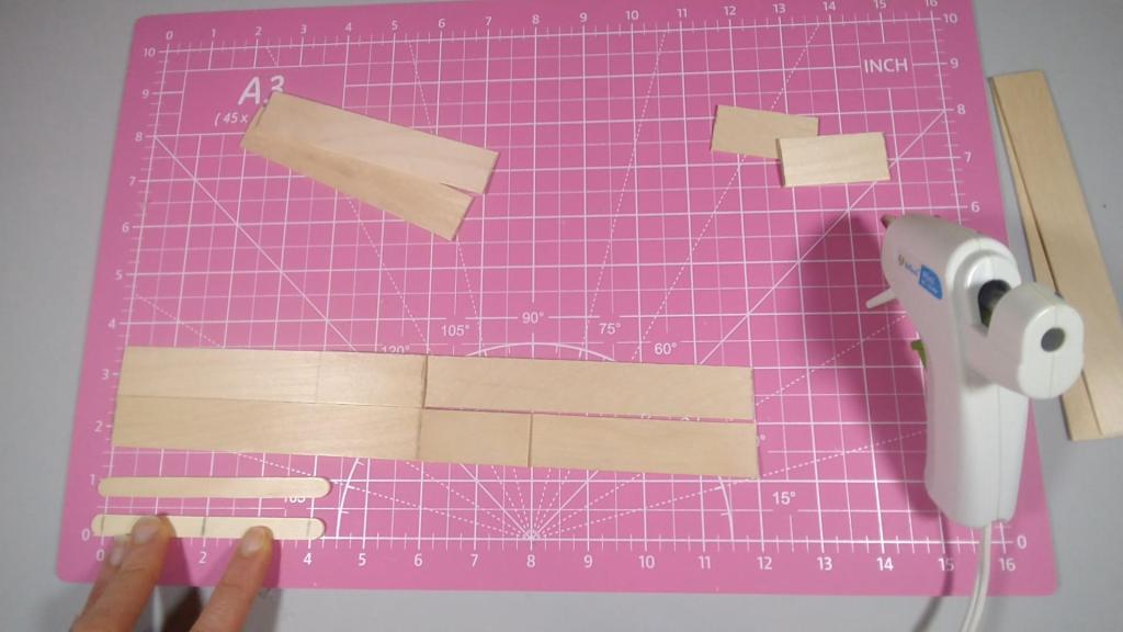 Then, I measured the cut the legs of the table. I used four jumbo craft sticks, aligned at 70 degrees and measuring 4.5″ tall.