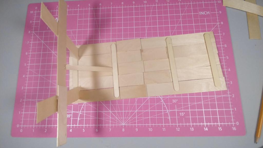 Next, I created the supporting beams that would run under the table and bench. I used three jumbo craft sticks, cut the rounded 0.5″ ends off, and then cut one in half (3.5″). I glued the 3.5″ section to the 7″ section to create a beam 9.75″ in length. I repeated this for the second set of sticks.