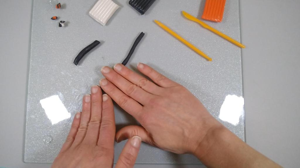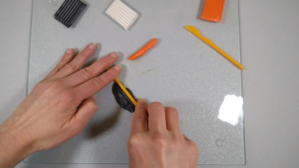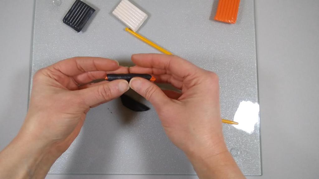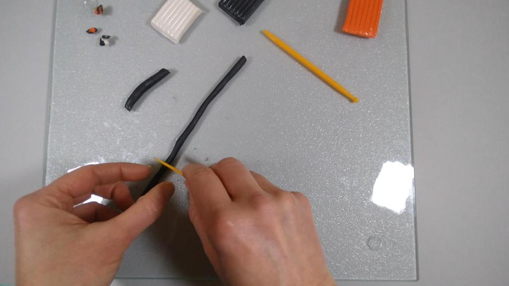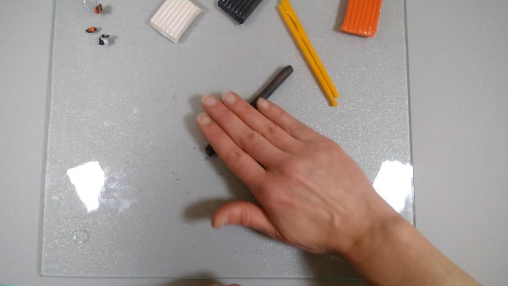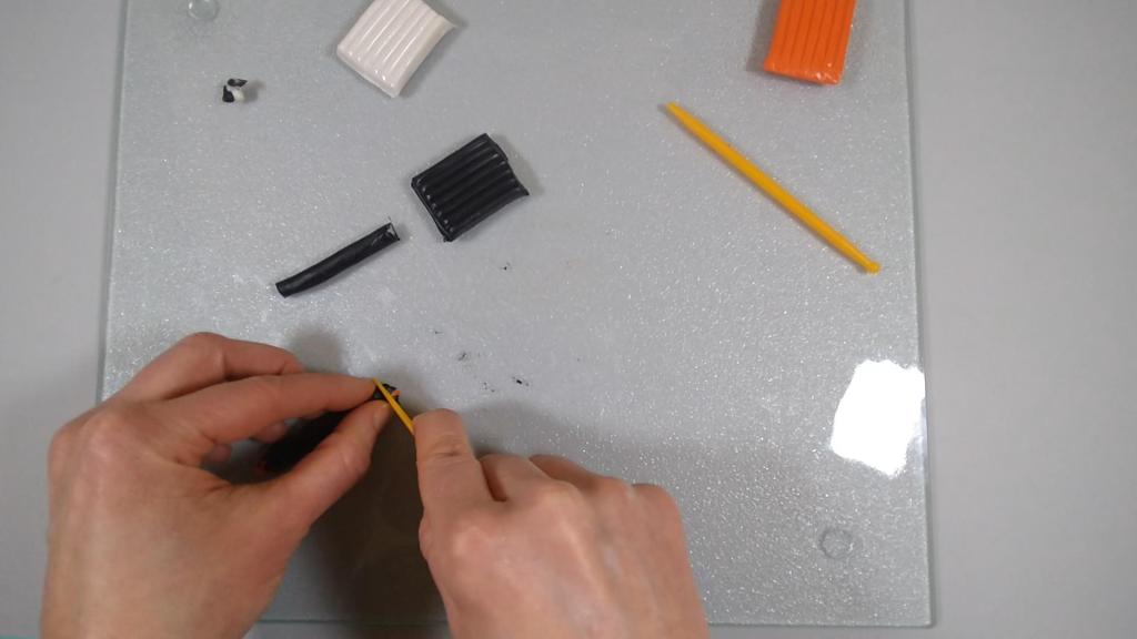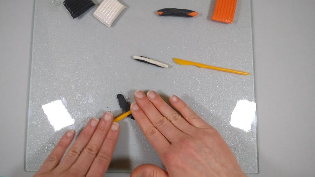 I cut a piece of orange clay and rolled that into a log. I then cut a piece of black clay and flattened that into a thin sheet.