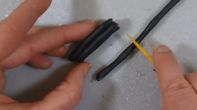 I covered the orange log with the black thin sheet. I needed to repeat the process to completely cover the orange log in a thin layer of black clay.