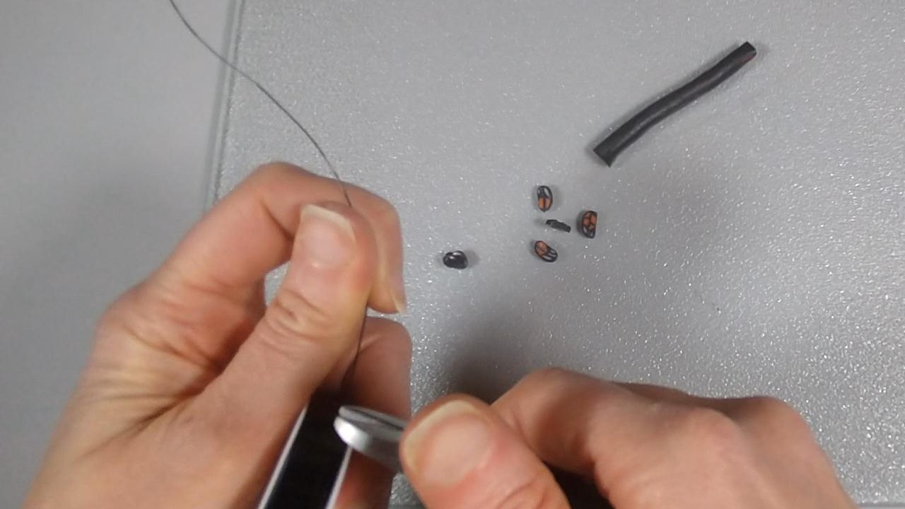 Next, I cut a piece of beading wire, about 6″ long. I rolled a small piece of black clay into a log and formed this around the end of the wire. This would form the body of the butterfly.