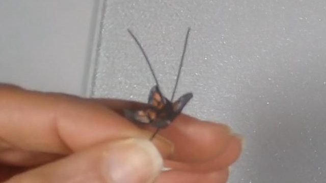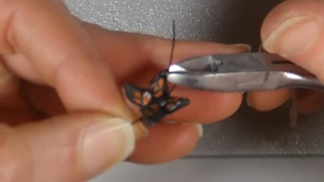 Then, I cut a piece of craft wire about 2″ long, then cut that in half. I inserted these into the front end of the butterfly body as antenna. Once they were in place, I trimmed them to about 1 cm.