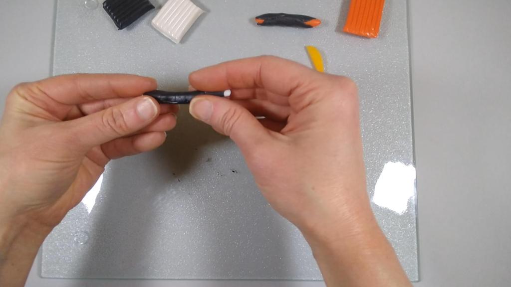 Next, I followed a similar procedure with a piece of white clay, slightly smaller than the orange. I rolled this piece into a log and then covered it with a sheet of black clay.