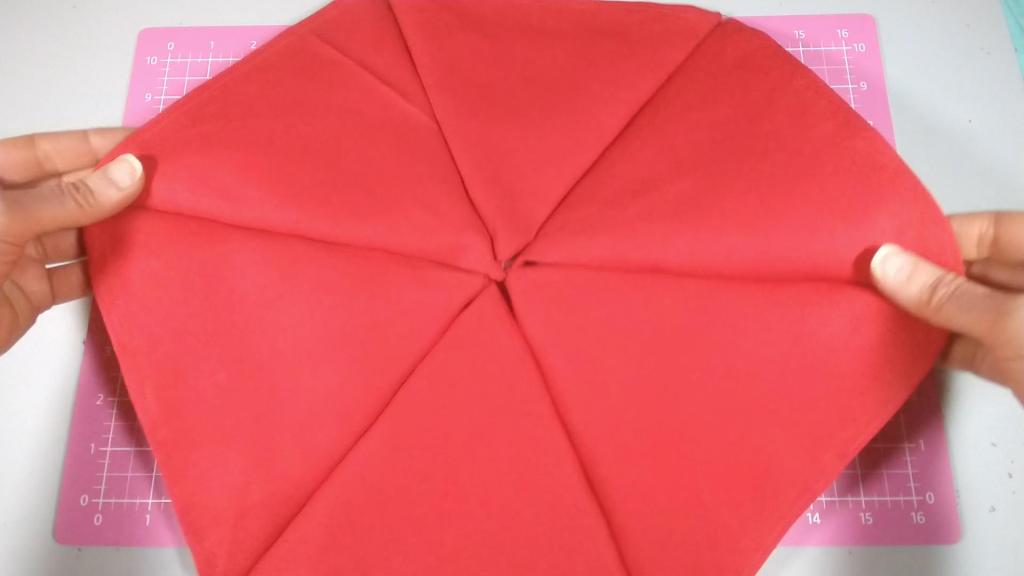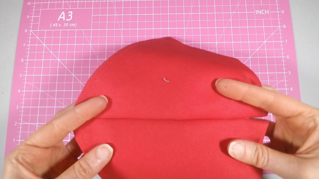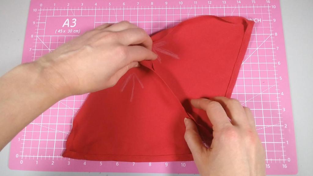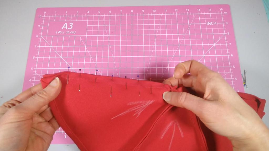 I marked the top angle with an arrow in pencil to remember the orientation. This point would be the center of the umbrella. Next, I pinned and sewed hems at each corner.