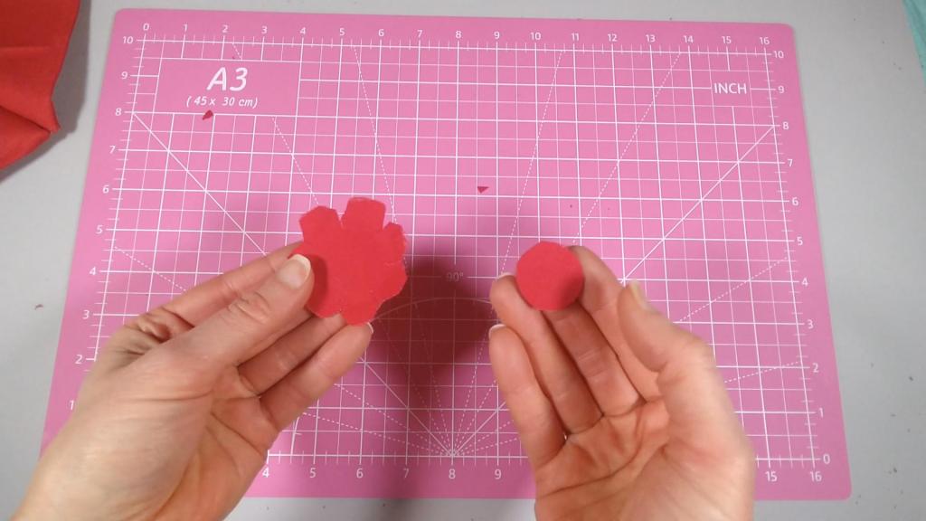 Next, I took a large button and cut two pieces of fabric to cover it. One I cut in an oversized flower pattern, the other in an undersized circle to just fit the button.